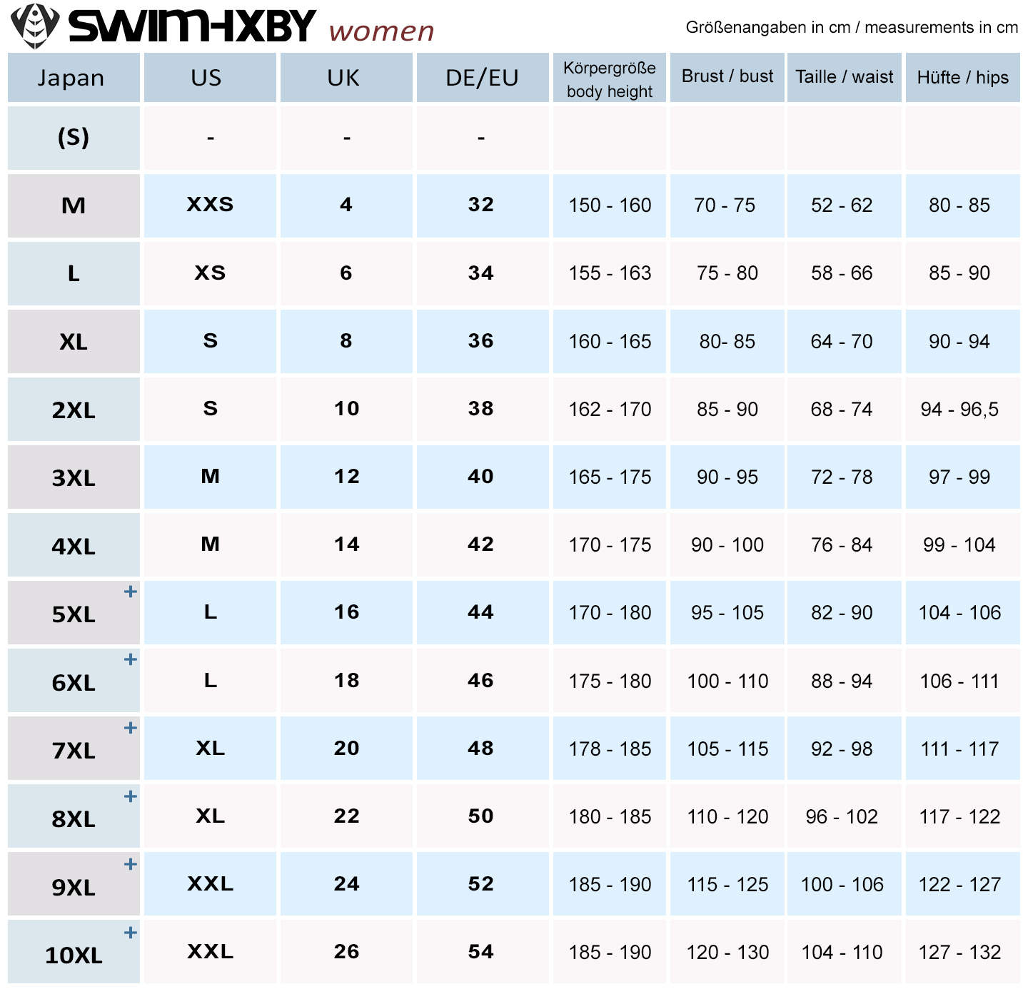 So far, it is the first supplier whose suits are available in almost all sizes – so for the first time I can also offer sizes beyond the German size 42: SwimHXBY produces most suits up to size 54 (UK26, XXL).
